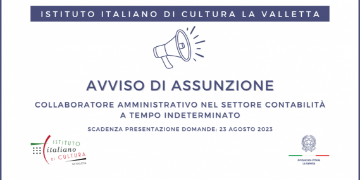 È indetta una procedura di selezione per l’assunzione a tempo indeterminato di n. 1 impiegato/a a contratto da adibire ai servizi di collaboratore amministrativo nel settore contabilità – manifestazioni culturali – traduzione presso l’Istituto Italiano di Cultura di La Valletta.