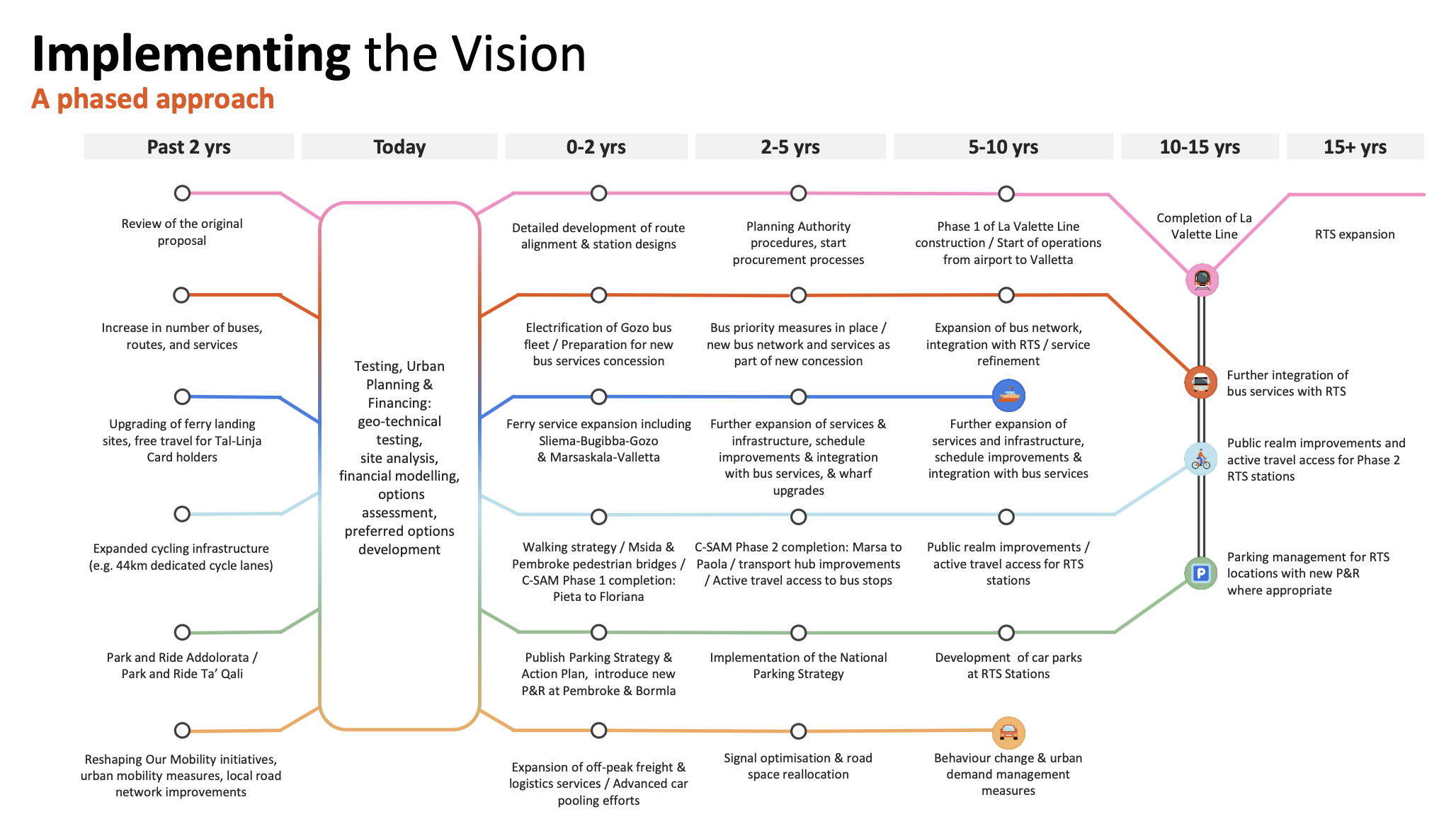 Il piano si inserisce nella cornice della Strategia Nazionale dei Trasporti 2050 già adottata dal governo, e si avvale del supporto tecnico di Arup, multinazionale di ingegneria e progettazione, affiancata dai partner locali Mizzi Studio e Living Bridge Studios, incaricati dell’identità visiva, della comunicazione e del coinvolgimento della comunità. Jonathan Mizzi, architetto e fondatore dello studio, riferendosi alla crescita demografica e alla congestione sperimentate dal Paese, ha commentato così il progetto: «Malta sta vivendo queste pressioni più intensamente della maggior parte dei luoghi», «Momenti come questo richiedono che pensiamo e agiamo insieme. Un’infrastruttura di questa portata deve sopravvivere ai cicli elettorali. È più grande di ciascuno di noi, e funzionerà solo se collaboriamo».