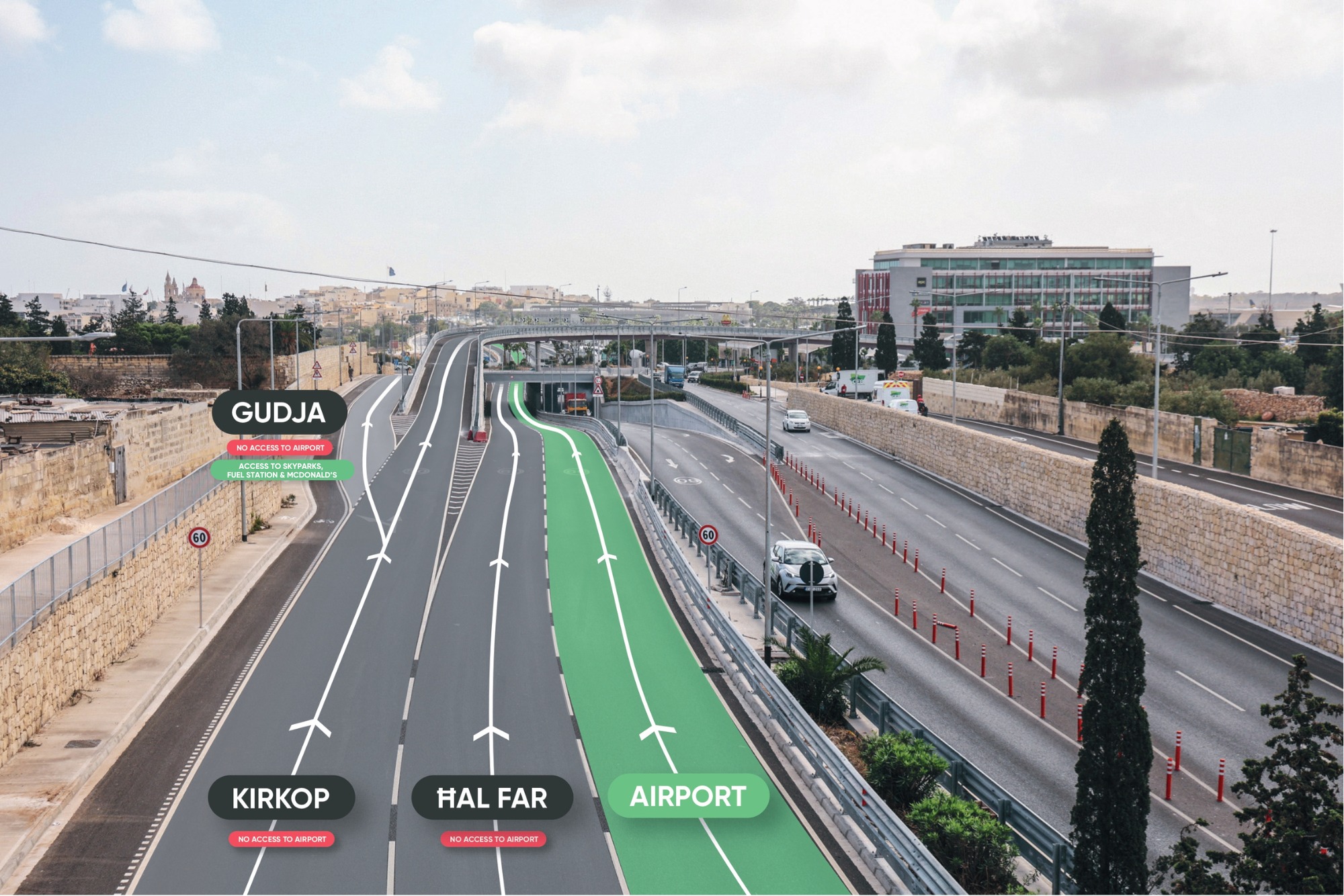 Per raggiungere l’aeroporto si dovrà ora imboccare Triq l-Avjazzjoni, con le autorità che consigliano agli automobilisti provenienti da Luqa e diretti verso lo scalo, di rimanere sulla corsia esterna della strada che porta ad Hal Far.