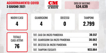 Oggi solo 4 contagi (ieri erano 10), mentre i casi attivi sono 76, gli stessi di ieri.
