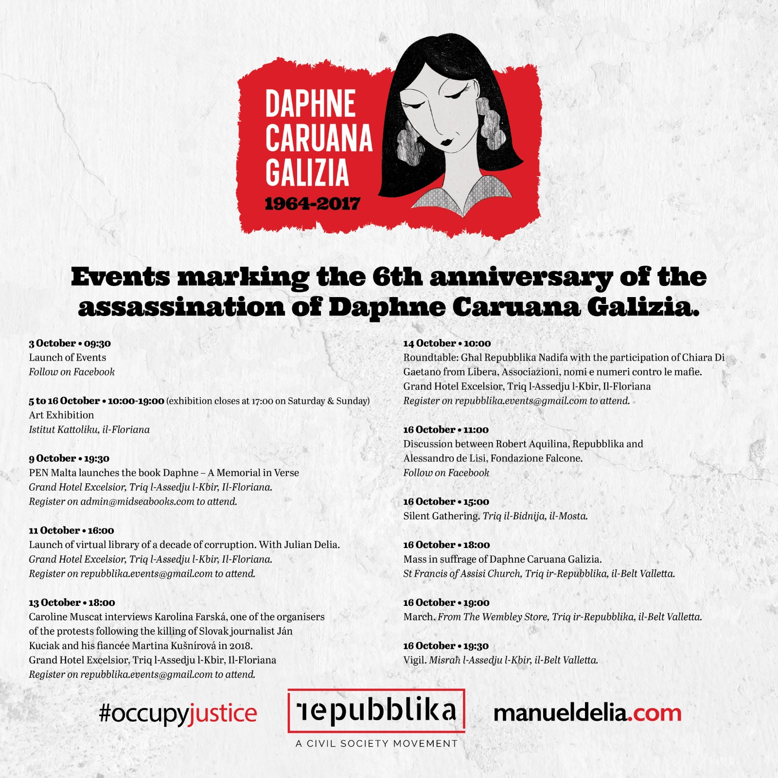 Nella mattinata del 16 ottobre Robert Aquilina e Alessandro de Lisi della Fondazione Falcone terranno un dibattito online poi, nel pomeriggio, alle 15:00, a Bidnija ci sarà una commemorazione per la morte di Daphe alla quale seguirà la Messa in suffragio alle ore 18:00 presso la Chiesa di San Francesco d’Assisi, seguita da una marcia dal Wembley Store alla Great Siege Square di Valletta, dove alle 19:30 si terrà la veglia per chiedere verità e giustizia.