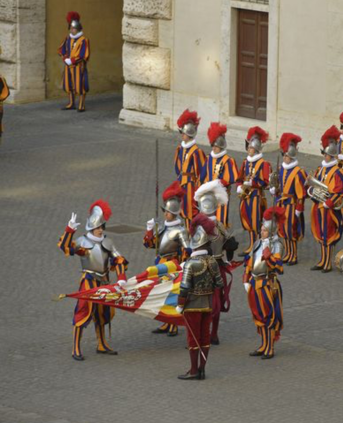 Fu un Papa celebre, Giulio II, che volle fondare un corpo armato addetto alla guardia del Pontefice: nel 1506 un reparto di 150 guardie svizzere, tutte provenienti dal Cantone di Zurigo, al comando di Kaspar von Silenen del Cantone di Uri, fece il suo ingresso in Vaticano entrando dalla Porta del Popolo. Anche dopo la fine del potere temporale dei Papi, nel 1870, gli “Svizzeri” continuarono la loro opera a fianco del Pontefice romano, sia pure con compiti diversi: oggi prestano Servizio d’Onore, di controllo e ordine, montano la guardia agli ingressi del Palazzo Apostolico, nei cortili di San Damaso e del Belvedere, nei piani delle varie Logge, nella Sala Regia, davanti agli uffici della Segreteria di Stato, nell’appartamento privato del Papa, agli ingressi esterni. Inoltre, sono impegnati quando il Santo Padre è presente nelle celebrazioni liturgiche in San Pietro, nelle Udienze Generali, nelle visite dei Capi di Stato, di Governo, Ministri degli Esteri e Ambasciatori.