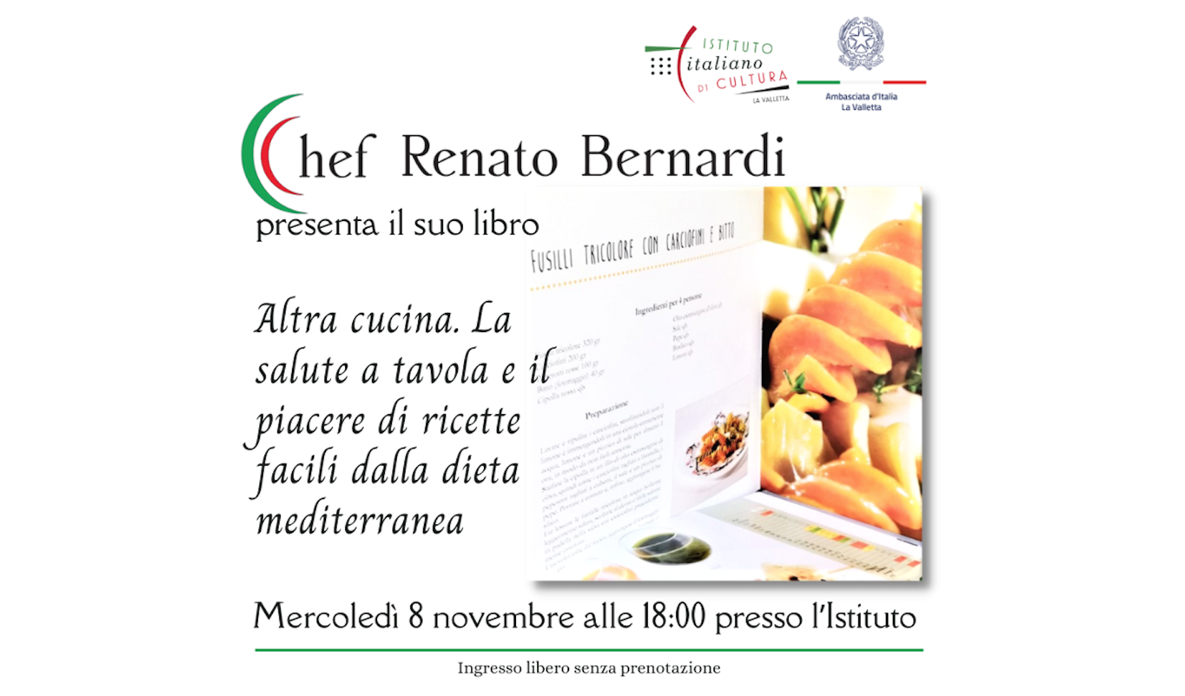 In occasione della VIII Settimana della Cucina Italiana nel Mondo, l’Istituto Italiano di Cultura e l’Ambasciata d’Italia a Malta hanno il piacere di invitare il pubblico alla presentazione del libro “Altra cucina. La salute a tavola e il piacere di ricette facili dalla dieta mediterranea” dello Chef Renato Bernardi.